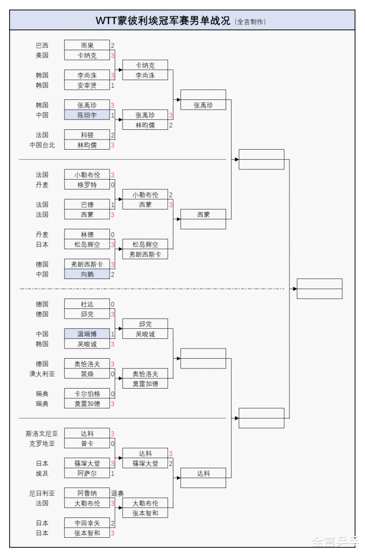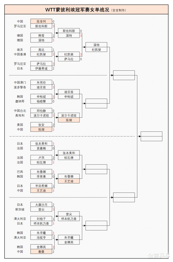 此外,女单卫冕冠军大藤沙月(日本)不敌曾尖(新加坡)、男单卫冕冠军小勒布伦(法国)被队友西蒙(法国)逆转,其余出局的名将还有不少,目前已有5人率先晋级8强,详细战况如下: