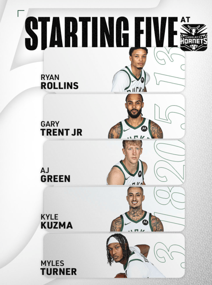 赛前,雄鹿公布球队本场首发阵容:莱恩-罗林斯、小加里-特伦特、AJ-格林、凯尔-库兹马和迈尔斯-特纳。