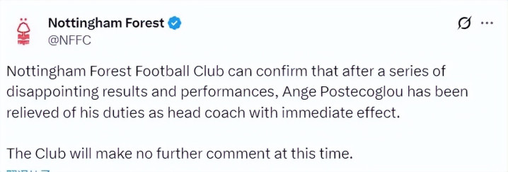 官方:诺丁汉森林宣布解雇主帅波斯特科格鲁。在诺丁汉森林0-3输给切尔西的几分钟后,森林就官方宣布了这一决定。