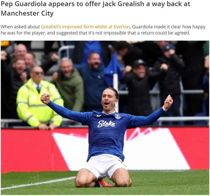 瓜迪奥拉在曼城对埃弗顿的赛前新闻发布会上暗示,格拉利什未来有可能重返俱乐部。