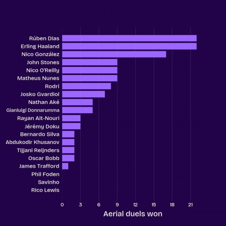 直播吧10月31日讯数据机构squakwa统计了本赛季曼城队内的英超成功争顶情况,哈兰德和鲁本-迪亚斯并列最多。