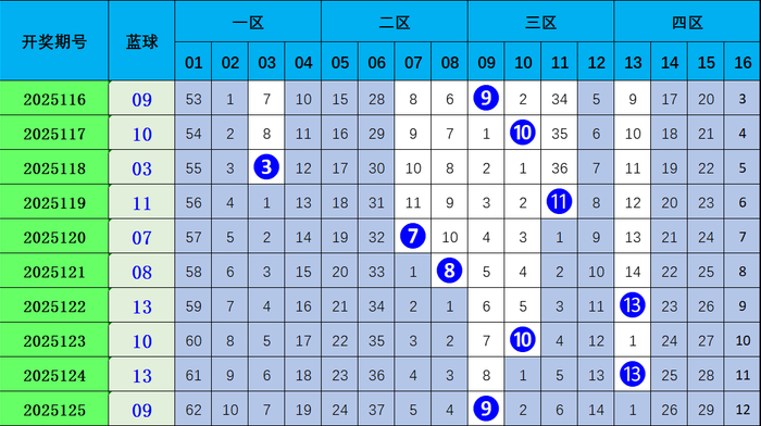 上期开出号码09,奇数,区间分析:近十期,一区开出1次,二区开出2次,三区开出5次,四区开出2次,总体3区出码较多,综合分析,本期预测蓝球下降点位开出,推荐2区数码08。