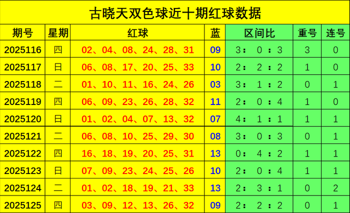 三区分析:上期红球三区比为2:2:2,本期预测三区比为2:3:1。