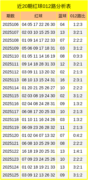 最近20期红球012路比为38:42:40,最近两周红球012路比为11:15:10,上期红球012路比为3:1:2。