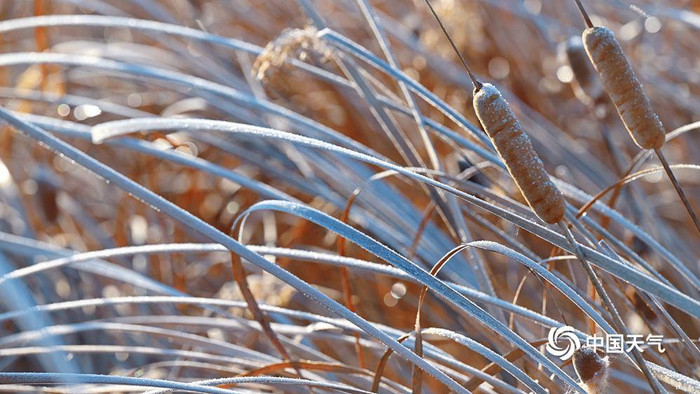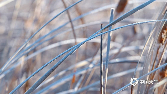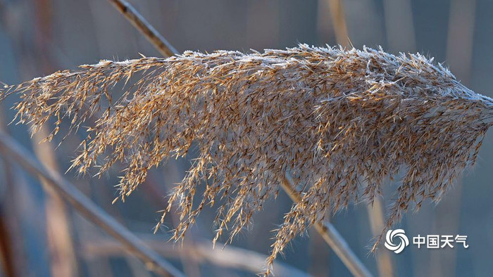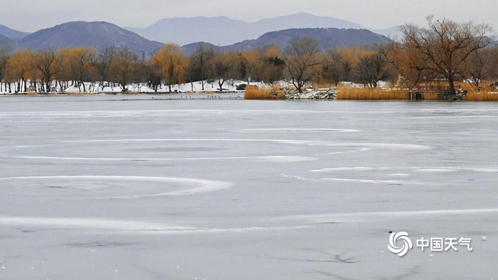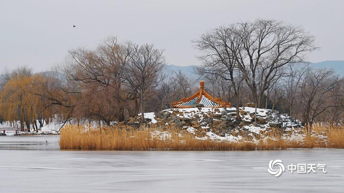12月17日,在北京圆明园,芦苇上的白霜与湖面及地面上未融的积雪相互映衬,远处的西山清晰可见,共同勾勒出冬日风光。